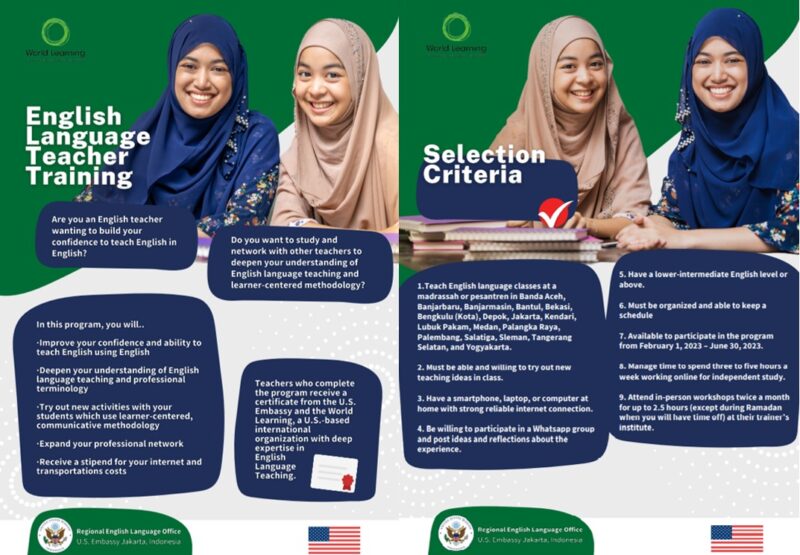 It is a collaboration between RELO, the World Learning, and islamic state universities (UINs/IAINs) in Indonesia. This will be the second ELTT Program held to date. You (or your colleagues) will complete two courses of the ELTeach program from the National Geographic Learning within a five-month schedule under the theme English for Teaching and Professional Knowledge for English Language Teachers. The participants will attend corresmponding workshops and apply the resulting learning practices in their class(es).