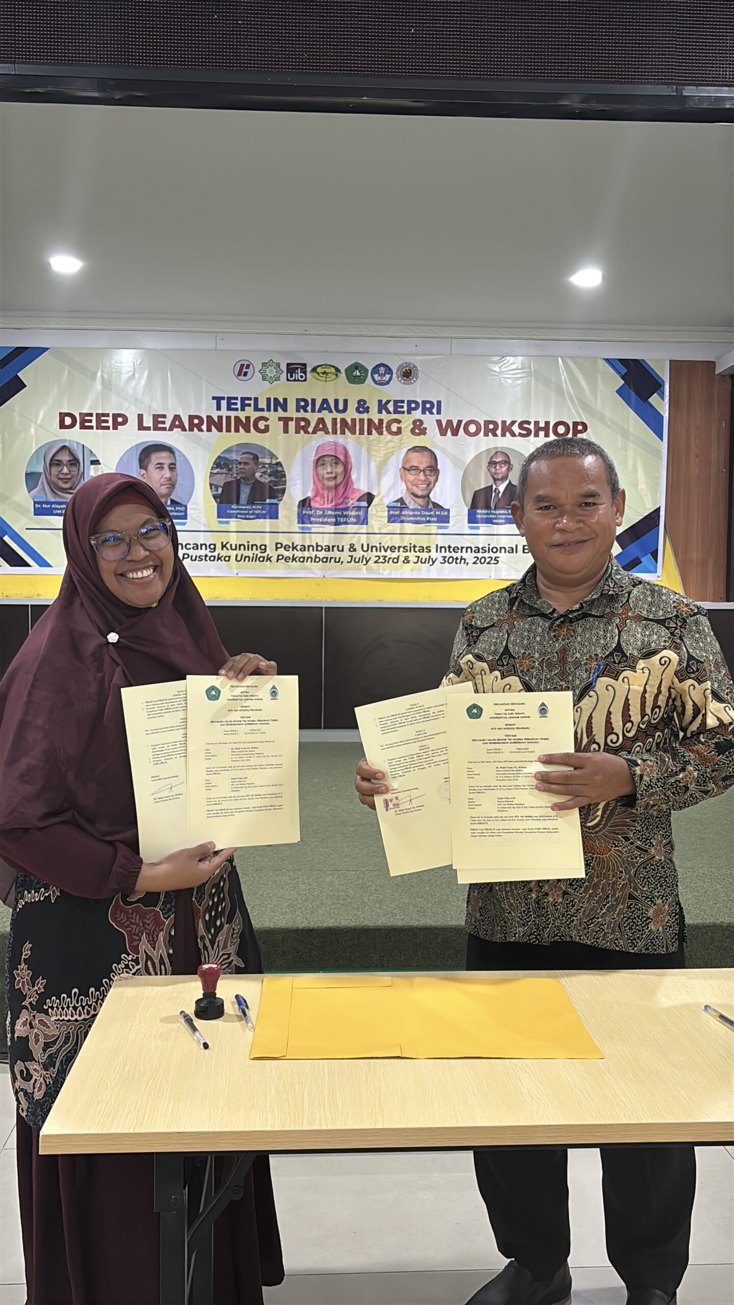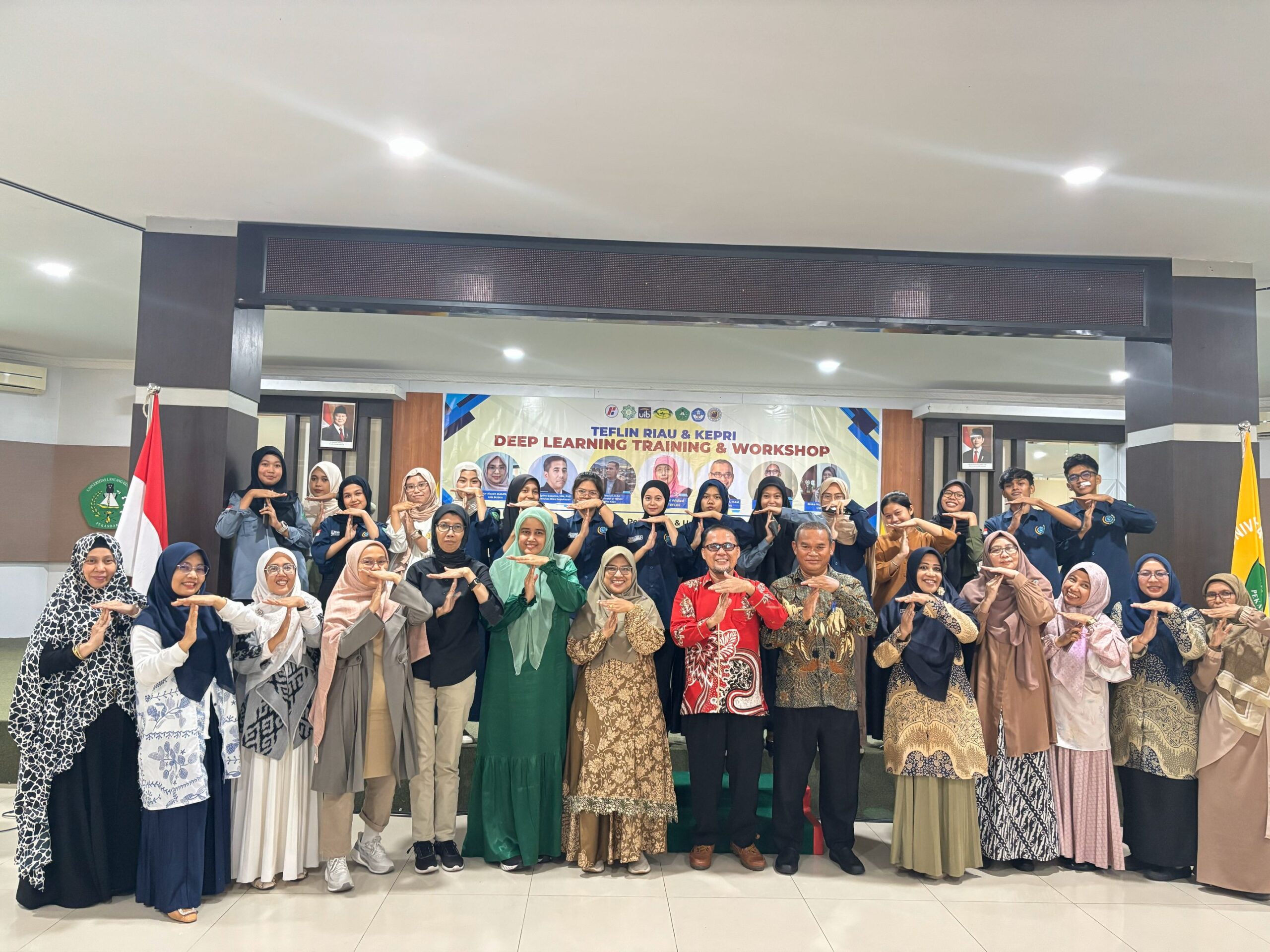 On July 23 and 30, 2025, the TEFLIN Riau Chapter successfully organized a Deep Learning Training and Workshop (DLTW) at Aula Pustaka, Universitas Lancang Kuning, Pekanbaru. This event was part of a national professional development initiative designed to equip English teachers with the knowledge and skills necessary to implement Deep Learning in their classrooms. This workshop followed a nationwide online session that brought together over 900 participants from 20 TEFLIN Chapters across Indonesia. The virtual session featured three of Indonesia’s most respected education scholars, Prof. Utami Widiati, Prof. Ali Saukah, and Prof. Suwarsih Madya, who presented the theoretical framework, policy relevance, and practical significance of Deep Learning in English language education. In the Riau regional session, the workshop was led by Kurniawan, S.S., M.Pd., who guided participants through hands-on strategies to apply Deep Learning concepts in teaching English, with a focus on Classroom English, lesson design, and student-centered learning activities.