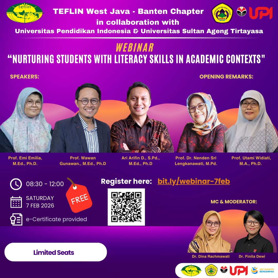 In response to these challenges, TEFLIN Regional Coordinators of West Java and Banten, in collaboration with Universitas Pendidikan Indonesia (UPI), Universitas Sultan Ageng Tirtayasa (UNTIRTA), and the English Teachers’ Association of Bandung City (MGMP), are organizing a webinar entitled “Nurturing Students with Literacy Skills in Academic Contexts.” The webinar is intended as a professional development forum for teachers, lecturers, and pre-service teachers to strengthen the integration of literacy and academic reasoning into English language teaching and assessment.