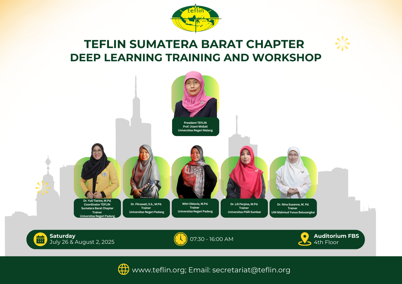 The TEFLIN Sumatera Barat Chapter successfully held a teacher training and workshop on Empowering English Teachers through Deep Learning Workshop.