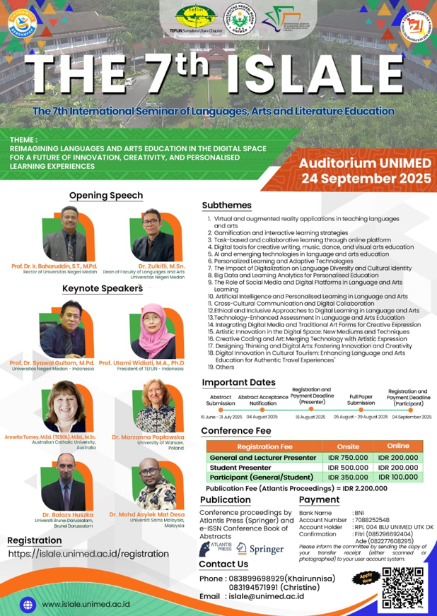 On September 24, 2025, the Faculty of Languages and Arts, Universitas Negeri Medan, successfully hosted the International Seminar of Languages, Arts, and Literature Education (ISLALE 2025) in a blended format, combining onsite and online participation.